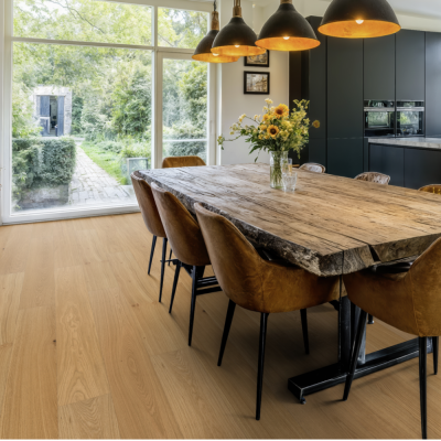 artureon SCELTA – W50361 – sở hữu sàn gỗ be ấm, mang vẻ tự nhiên, nhẹ nhàng nhưng vẫn giàu chiều sâu vân gỗ. Các đường vân uốn lượn mềm, xen kẽ mắt gỗ nhỏ tạo cảm giác chân thực như gỗ nguyên bản, thích hợp cho phong cách Modern Rustic, Scandinavian, Minimalist hoặc các không gian cần cảm giác ấm vừa – không quá tối, không quá vàng.